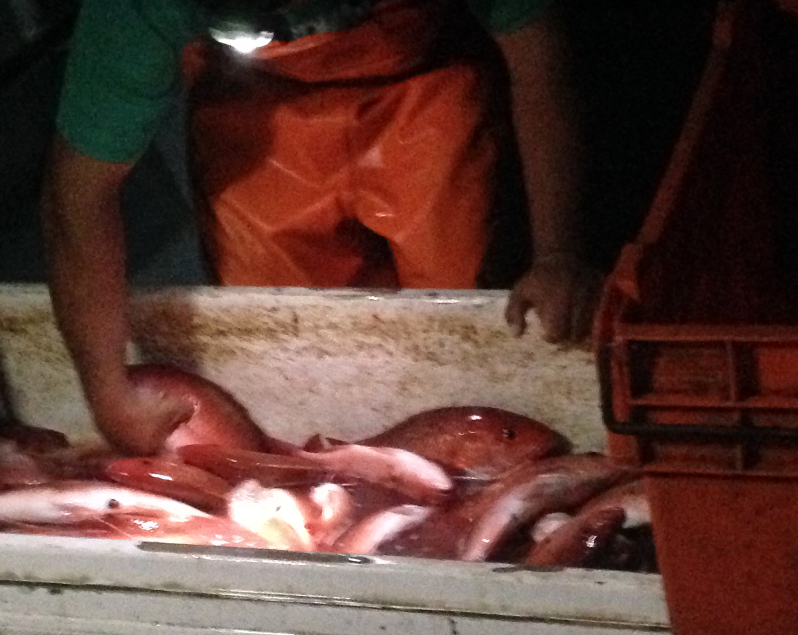 Our field trip continued to join another group of free fishers (not belonging to any cooperative), next to Cabo Pulmo on the east coast of BCS. We camped on the beach not far from the fishers beach camp (fig. 4), as they were traveling from a inland village. The first night, we noticed a lot of activity in the fish camp and although it was pitch black and midnight, fishers were going out to fish for red snapper, using hook and line (fig. 5). Because there is another species eating the very expensive bait in the day time, going out at night is the only alternative. Fishers said that some times bait costs more then the income from selling the catch.